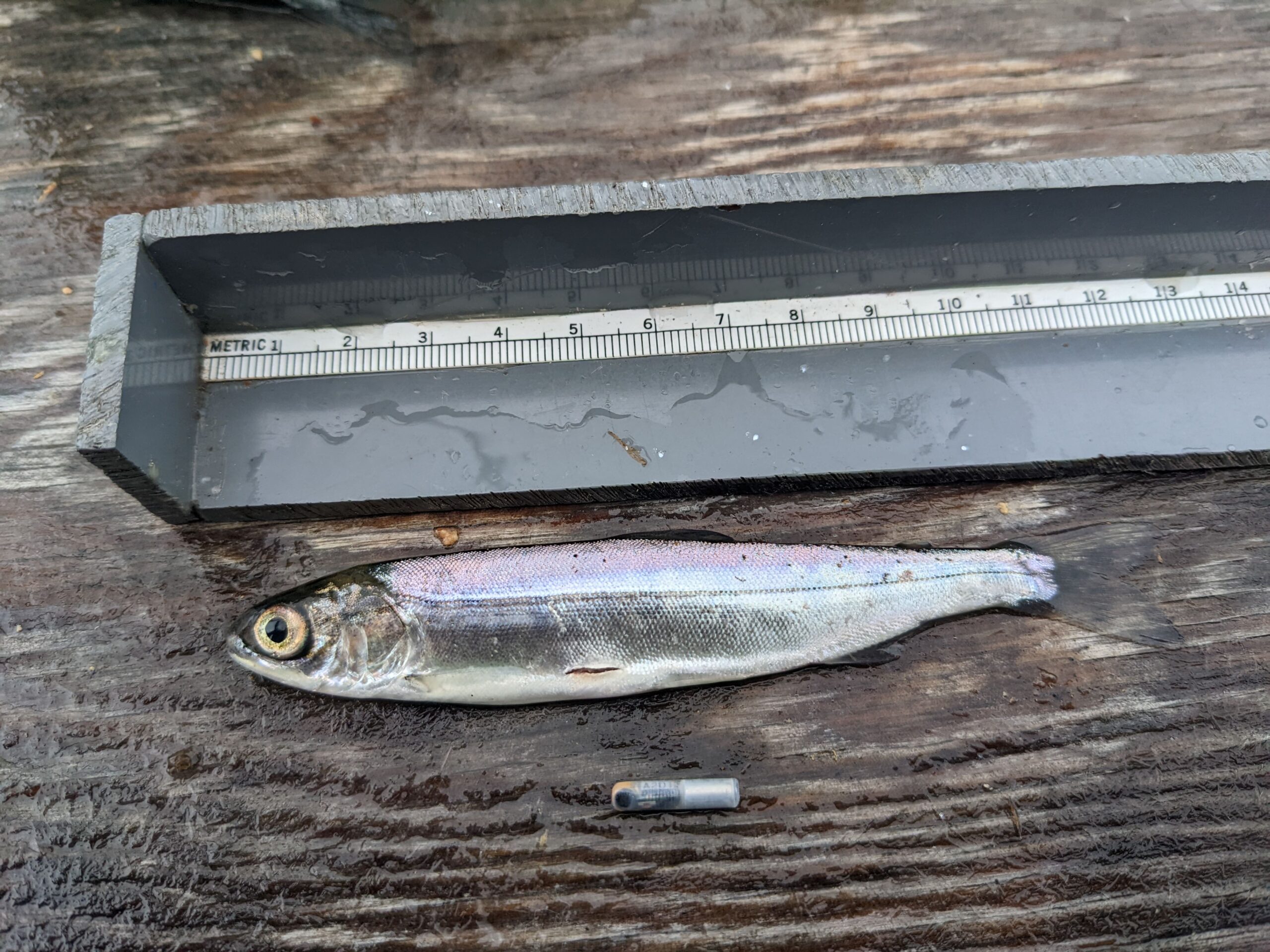 These juvenile salmon only migrate at night, which is believed to be a strategy to avoid visual predators. This meant that our researchers had to catch the fish at midnight. The fish that are a part of this project were captured in a fyke net, a cone-shaped net with hoops and broad wings. Fish were transferred to covered 5-gallon buckets with aquarium aerators along the riverbank and held until morning. Fish were processed one by one, carefully following animal care and use guidelines, including the use of anesthesia. Following surgery, they were returned to the buckets to recover. The surgical process took 2-3 minutes per fish, and fish were fully recovered in 2-3 minutes following surgery. Fish were held in the buckets for 24 hours post-surgery. We included an equal number of "control" fish handled similarly to the tagged fish but did not undergo surgery. All our fish recovered quickly and survived through the entire holding period.